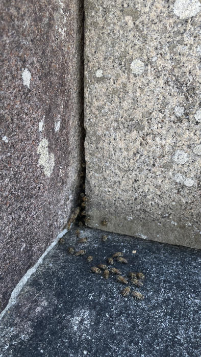 草を取ってると耳元で羽音がする。んっ?よく見ると墓の周りをミツバチがいっぱい飛んでる。まさか!墓の反対側へ回ると墓石と花立石の隙間にミツバチが出入りしてるやん。さすがにこれを見てしまうと放置できぬ。草取りをしてると奥さんも来てくれた。ワシ1人でするって言ったのに来てくれた。奥さんに状況を説明。さすがに驚いてたが少し前に村の人から同じ話を聞いたらしい。その人はビニール袋で隙間を囲ってからハチ用殺虫剤を噴射して退治したと言ってたらしい。なのでそれに習いビニール袋と常備してるハチ用殺虫剤を取りに戻り、準備を終えて殺虫開始。