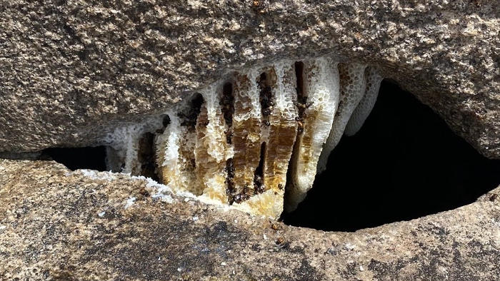殺虫剤を噴射すると隙間から凄い羽音。しばらく放置したのち花立石を奥さんと一緒に横にスライドさせて納骨室を露出。わおっ、凄い蜂の巣だ。蜂蜜も凄い。美味しそうだがもう殺虫剤を噴射してしまってるし、場所が納骨室ってこともありさすがに食すことなんてできない。